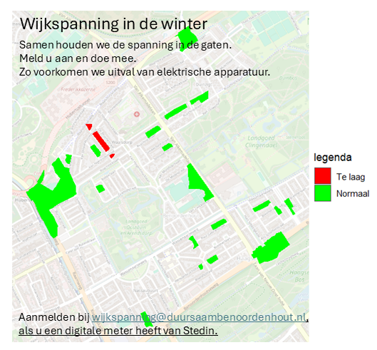 Op de winterkaart ziet u waar de gemeten spanning te laag is (rood) en waar de
