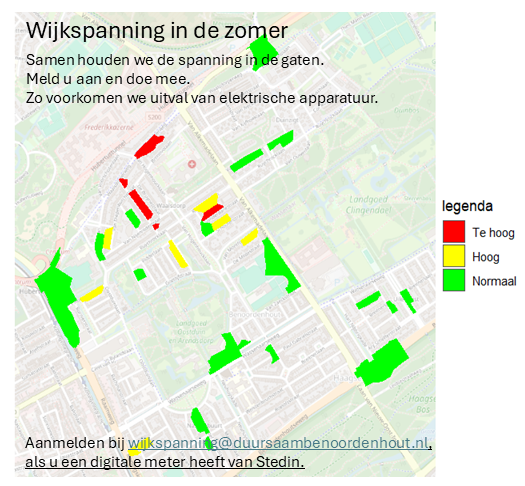 In de bijgevoegde kaartjes geven we u een overzicht waar in de wijk we samen met bewoners in de gaten houden hoe gezond onze wijkspanning is. We hebben namelijk te dunne kabels op veel plaatsen in onze wijk, en we willen dat Stedin tijdig de kabels vervangt, voordat er problemen optreden.